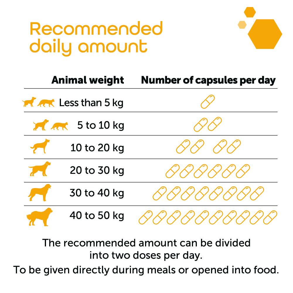 • Dogs, cats: one per 10 kg bodyweight twice daily