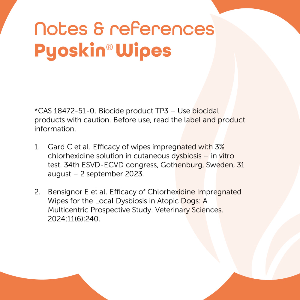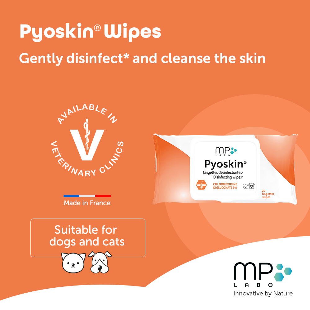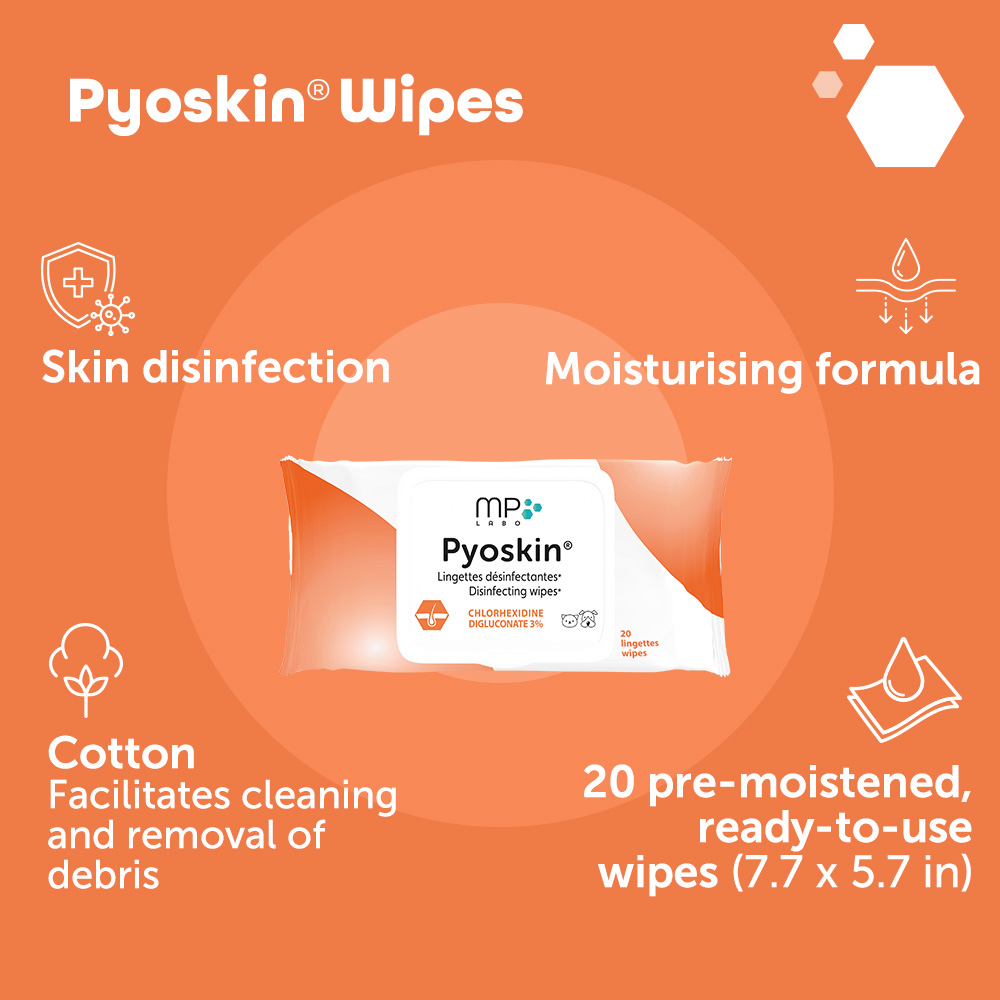 Pyoskin® Wipes are large format disinfectant wipes with 3% chlorhexidine* Pyoskin® cotton wipes make cleaning and removing skin debris easy. They are pre-impregnated and ready-to-use Pyoskin® Wipes disinfect the skin, interdigital spaces, and skin folds. They contain glycerin and allantoin that moisturise irritated or dry skin. *CAS 18472-51-0. Biocidal product TP3: use biocidal products with caution. Before use, read the notice and information concerning the product.