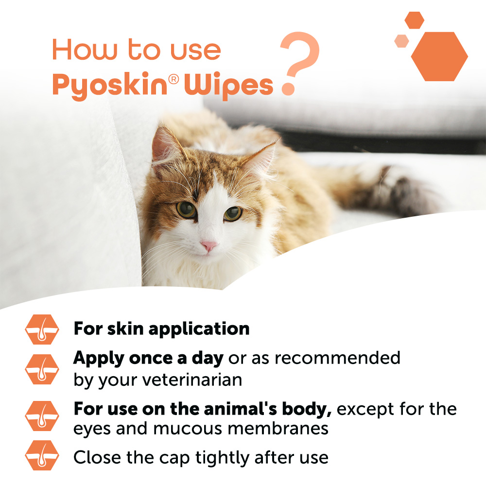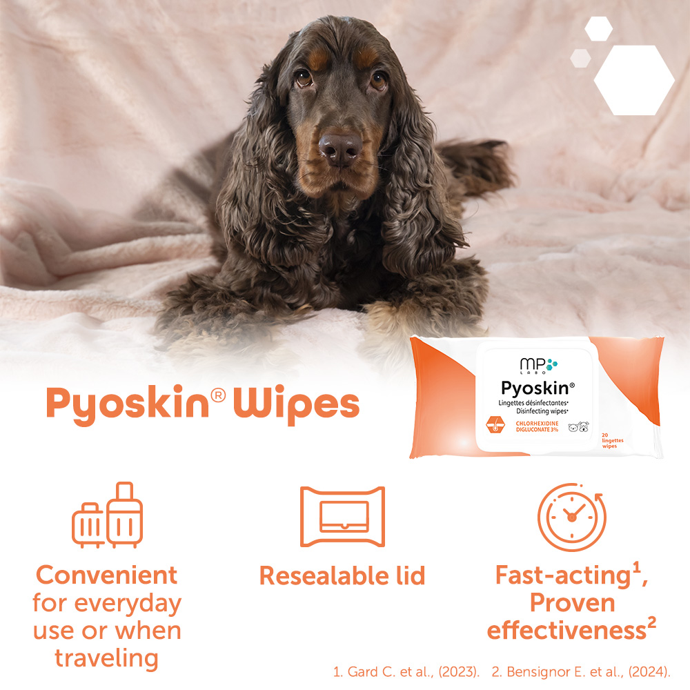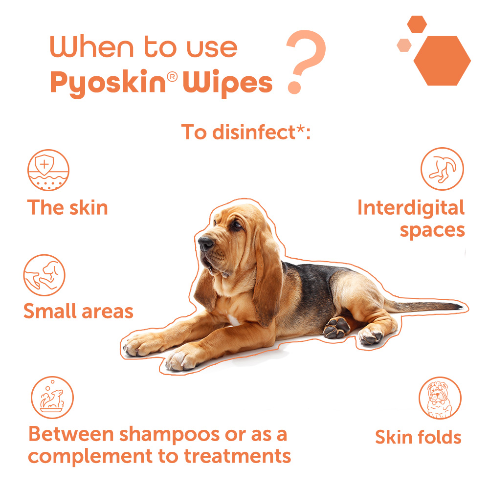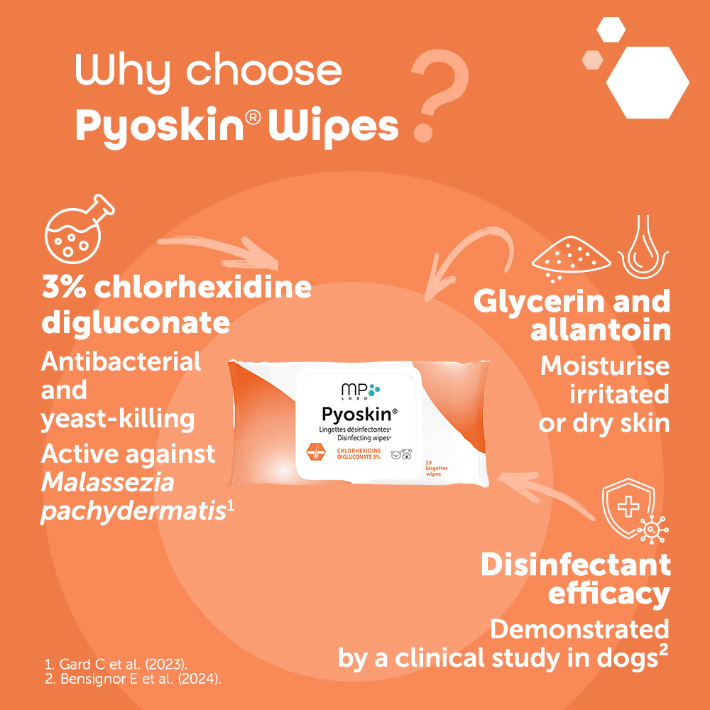 Pyoskin® Wipes are large format disinfectant wipes with 3% chlorhexidine* Pyoskin® cotton wipes make cleaning and removing skin debris easy. They are pre-impregnated and ready-to-use Pyoskin® Wipes disinfect the skin, interdigital spaces, and skin folds. They contain glycerin and allantoin that moisturise irritated or dry skin. *CAS 18472-51-0. Biocidal product TP3: use biocidal products with caution. Before use, read the notice and information concerning the product.