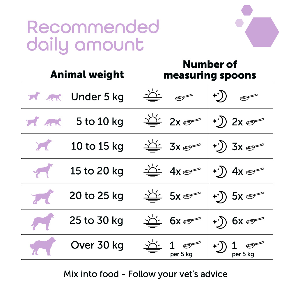 Dogs, cats: 1 measuring spoon for 5 kg  bodyweight, in the morning and in the evening,